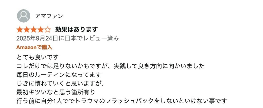 トラウマ転換ウォーキング(第三版)に また高評価が!(https://amazon.co.jp/dp/B09QZD4QC7) 良い方へ向かったとの声、良かったです! 最初はトラウマ想起が負担になる場合があるため、無理せず短時間から始め、必要に応じて専門家と併用してください。”安全第一”でご活用ください。